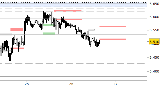 future Eurostoxx50, grafico a barre da 30 minuti. Prezzi fino al 26/03/26, ore 14.44, last 5510