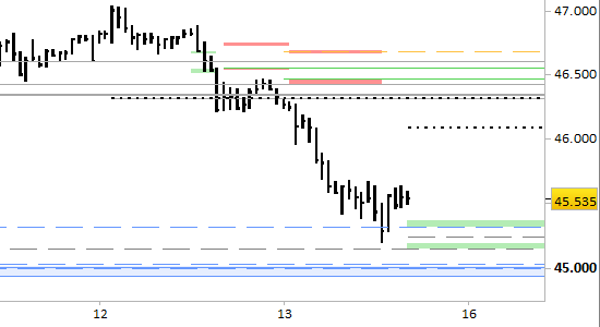 Fino a lunedì mattina (= brevissimo periodo) ci aspettiamo un rimbalzo fino a 46085. I supporti aggiornati si trovano a 45350/45370 e 45140/45160. Il segnale long di brevissimo periodo verrebbe annullato da prezzi inferiori a 45140.