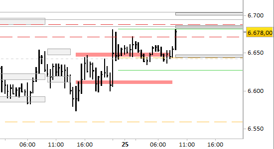 e.mini S&P future, grafico a barre da 30 minuti. Prezzi al 25/03/26, ore 9.30, last 6678.00