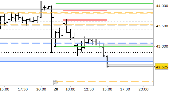 I prezzi hanno confermato le aspettative di arretramento, spostandosi stamane dal livello di 43655 fino agli attuali 42560, posizionandosi al di sotto del vecchio supporto/target di quota 43100.