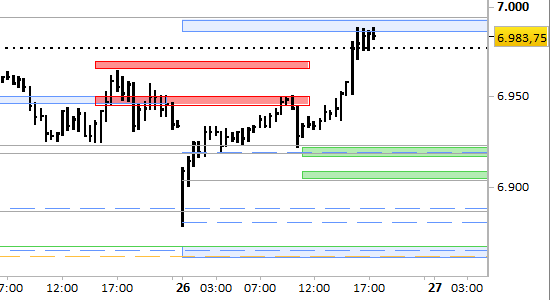 I prezzi hanno oltrepassato il target rialzista di brevissimo periodo a 6976.00, portandosi direttamente a contatto con l'area di resistenza principale a 3-5 giornate che si trova a 6990.00/94.00.