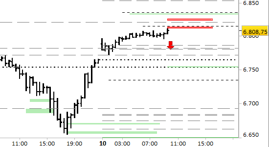 Apriamo short su cedimento di 6795.50; stop sopra 6827.00 senza attendere alcuna conferma.