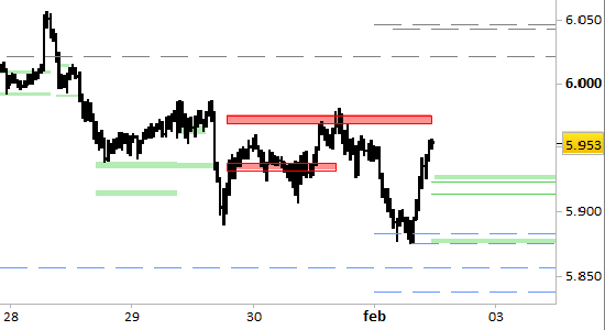 future Eurostoxx50, grafico a barre da 30 minuti. Prezzi fino al 02/02/26, ore 11.17, last 5953