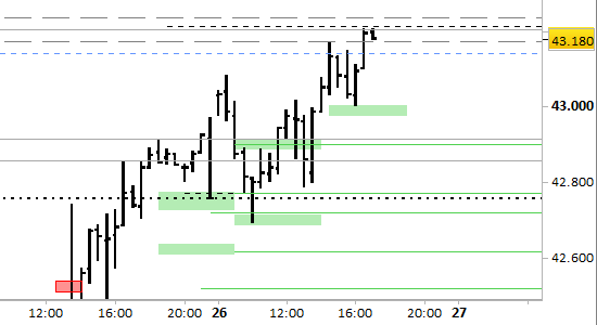 future FtseMib, grafico a barre da 30 minuti. Prezzi al 26/11/25, ore 17.01, last 43180