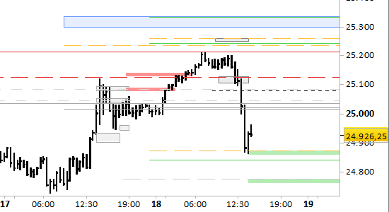 Non ci sono indicazioni di estensione ulteriore del ribasso nel breve periodo. si sono anzi formati supporti a 24870.00 e 24760.00 che sorreggono proiezioni di recupero fino a 25083.00/085.00. Di seguito dovremo attendere segnali. Il segnale long di breve periodo è attivo solo con rilevazioni stabilmente superiori a 24760.00.