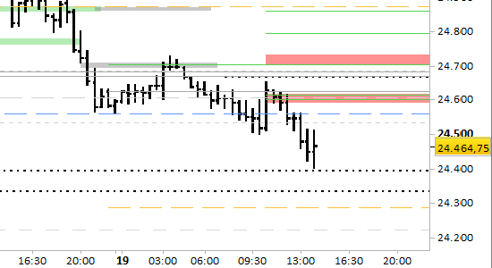 Dopo l'ultimo aggiornamento i prezzi sono scesi da 24650.25 fino ai minimi di giornata toccati a 24401.25. Non ci sono ancora le condizioni per abbassare le resistenze di breve termine, che rimangono a 24600.00 e 24735.00. Le attese rimangono di discesa verso 24225.00/24230.00, con supporti intermedi a 24395.00/24397.00 e 24330.00/24335.00. Il segnale ribassista è attivo nel breve periodo solo con rilevazioni stabili inferiori a 24735.00.