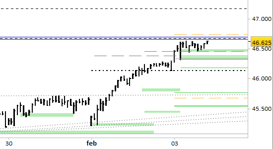 future FtseMib, grafico a barre da 30 minuti. Prezzi al 03/02/26, ore 13.39, last 46625