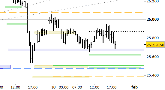 I prezzi sono tornati ad avvicinarsi ai supporti di brevissimo periodo (= fino a lunedì) posti a 25630.00/25635.00 e 25470.00/25480.00. Durante le prossime ore c’è ancora tecnicamente spazio per la ripartenza del recupero fino alla resistenza a 25990.00, dalla quale successivamente dovremo attendere indicazioni. Il segnale di brevissimo periodo verrebbe annullato dalla semplice violazione di 25470.00.