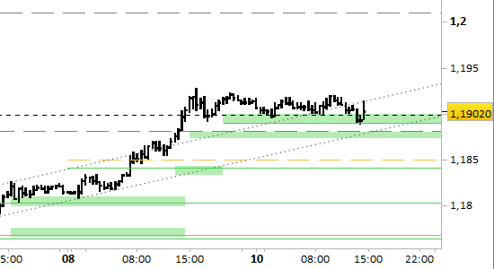 I prezzi sono tuttora fermi al test della zona dei supporti di brevissimo periodo (= prossime ore) posti a 1.1890 e 1.1870. Il segnale rialzista è ancora attivo. Le proiezioni forniscono un target a 1.2000 alla portata dei valori potenzialmente in giornata. Il segnale rimane attivo con prezzi superiori a 1.1870.