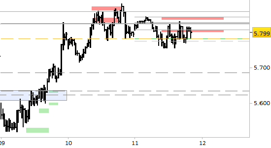 I prezzi non hanno ancora sviluppato l’atteso spunto ribassista, ma rimangono stabili sotto la zona delle resistenze di breve periodo, valide fino all’aggiornamento di domattina, poste a 5800 e 5845. Confermiamo proiezioni ribassiste fino a 5687, passando per un primo target intermedio a 5721. Il segnale short di breve periodo è attivo solo con rilevazioni stabilmente inferiori a 5845.