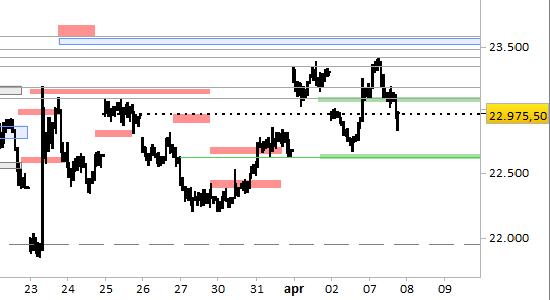 Indice DAX, grafico a barre da 30 minuti. Prezzi al 07/04/26, ore 16.30, last 22975.50