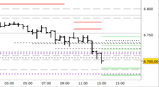 Il segnale tecnico è long a mercato e su test del primo supporto. Stop sotto 6672.00 senza attendere alcuna conferma.