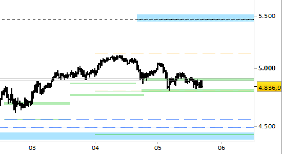 Il segnale rialzista di breve periodo verrebbe abbandonato in caso di cedimento di 4785.0; sotto, si aprirebbe la strada per un possibile riavvicinamento ai minimi, sul supporto principale di tendenza.