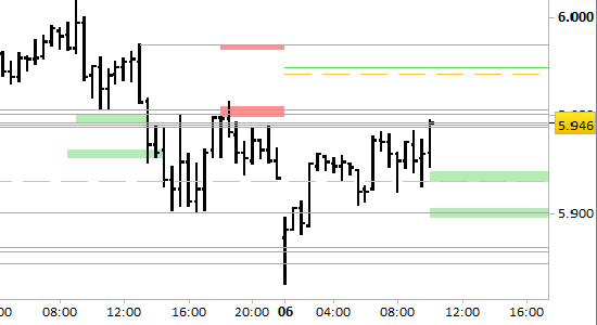 future Eurostoxx50, grafico a barre da 30 minuti. Prezzi fino al 06/02/26, ore 10.17, last 5946