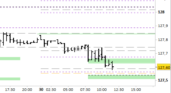 I prezzi si trovano in area di probabile reazione, fra i supporti a 127.63/65 e 127.50/53.