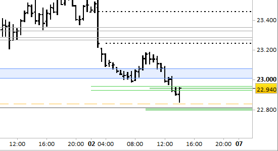 I prezzi stanno effettuando il test della zona dei supporti confermati a 22950/22960 e 22790/22810; si trovano quindi in area di probabile reazione.
