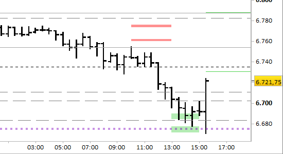I prezzi sono riusciti a toccare un ultimo minimo a 6670.50 prima di risalire a 6721.75. La posizione long aperta a 6700.75 è stata chiusa in stop a 6671.75.