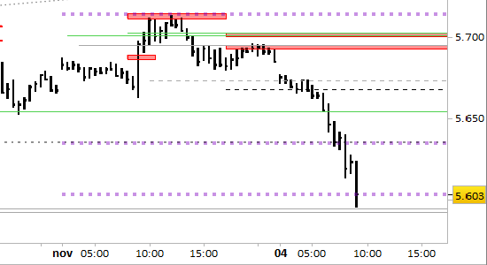 future Eurostoxx50, grafico a barre da 30 minuti. Prezzi fino al 04/11/25, ore 9.23, last 5603