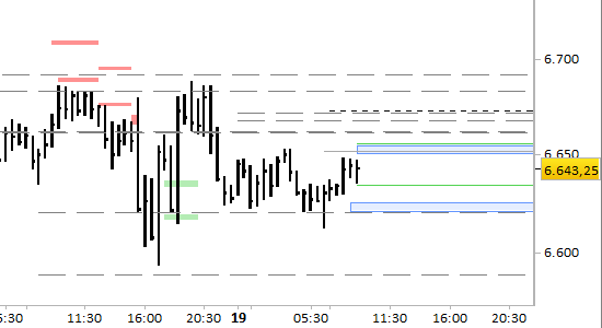 L'area fra 6621.00 (supporto) e 656.50 (resistenza) è zona di probabile stabilizzazione in corso di mattinata.