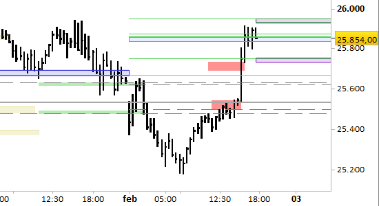 future e.mini Nasdaq, grafico a barre da 30 minuti, prezzi al 02/02/26, ore 17.46, last 25854.00