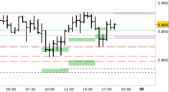 future Eurostoxx50, grafico a barre da 30 minuti. Prezzi fino al 08/04/26, ore 18.51, last 5863