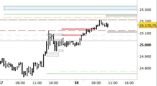 future e.mini Nasdaq, grafico a barre da 30 minuti, prezzi al 18/03/26, ore 9.49, last 25170.75