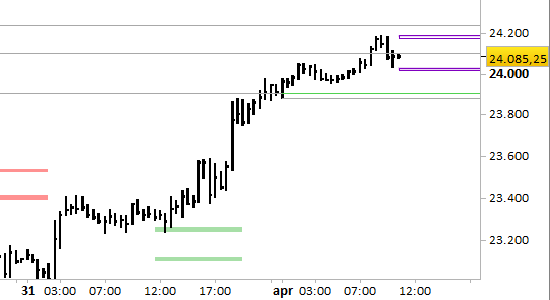 future e.mini Nasdaq, grafico a barre da 30 minuti, prezzi al 01/04/26, ore 10.39, last 24085.25