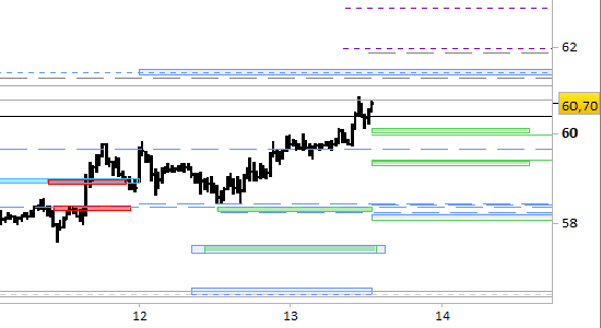 La posizione long aperta ieri a 58.52 è stata chiusa sul target a 60.30.
