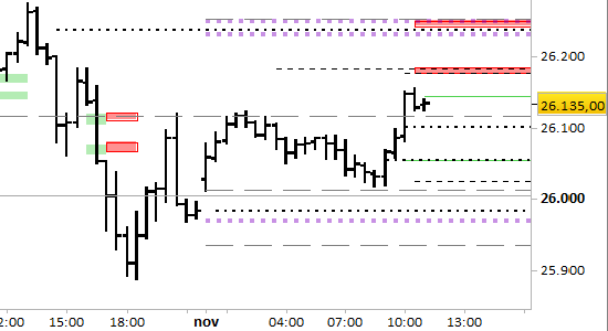future e.mini Nasdaq, grafico a barre da 30 minuti, prezzi al 03/11/25, ore 11.16, last 26135.00