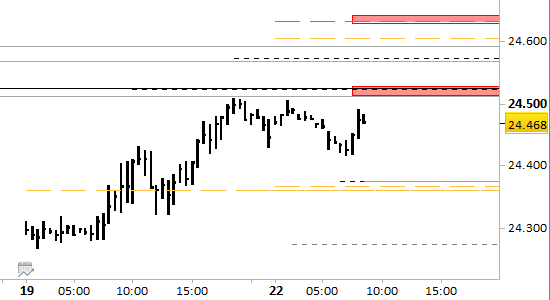Il segnale tecnico è short a mercato e su test della prima resistenza. Stop sopra 24643 senza attendere alcuna conferma.