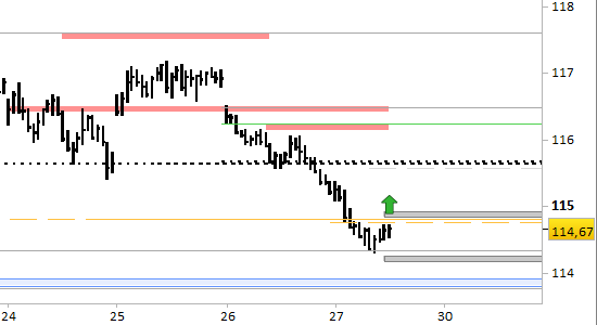 I prezzi dopo l'aggiornamento di ieri hanno esteso il ribasso fino a 114.32, oltrepassando entrambi gli obiettivi di breve periodo a 115.66/115.68 e 114.80/114.82.