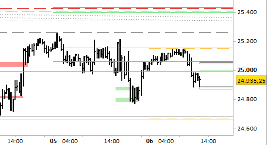 I prezzi stanno oscillando nel mezzo del range di medio periodo compreso fra i noti livelli a 24300.00 (supporto) e 25500.00/25530.00 (resistenza), in un contesto correttivo/ribassista provvisoriamente impegnato in fase di oscillazione laterale. Le premesse tecniche sono ribassiste fino al test pieno del supporto di medio periodo, ma non sono ancora visibili nel breve periodo indicazioni chiare di ripresa della pressione ribassista.