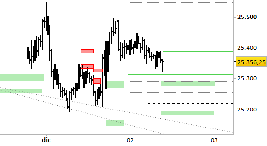 future e.mini Nasdaq, grafico a barre da 30 minuti, prezzi al 02/12/25, ore 9.16, last 25356.25