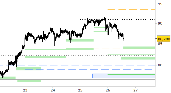 future Silver, grafico barre da 30 minuti. Prezzi al 26/02/26, ore 13.31, last 86.280
