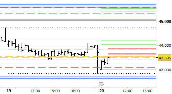 Per quanto riguarda il breve periodo, aggiorniamo i livelli validi per la sessione odierna: resistenze principali a 43640/43660 e 43900/43920, supporto principale a 43100. I valori si stanno riavvicinando alla zona delle resistenze, che costituiscono punti di probabile ripiegamento per un ritorno sul supporto tra oggi e lunedì. Il segnale short è valido solo con rilevazioni stabilmente inferiori a 43920.