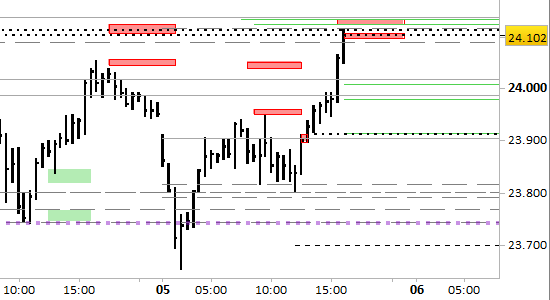 Il segnale tecnico è short a mercato. Stop sopra 24140 senza attendere alcuna conferma.