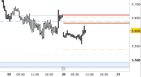 Con i minimi odierni a 5559 i prezzi si sono portati relativamente vicini alla parte inferiore del range, per cui potrebbero formarsi indicazioni di breve periodo rialziste. Seguiamo con attenzione l'evolversi dell'oscillazione, tenendo sotto stretto monitoraggio i livelli di breve periodo.