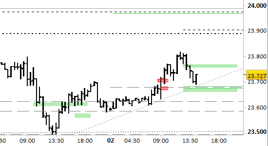 Conserviamo la posizione long aperta a 23782. Stop sotto 23569 senza attendere alcuna conferma.