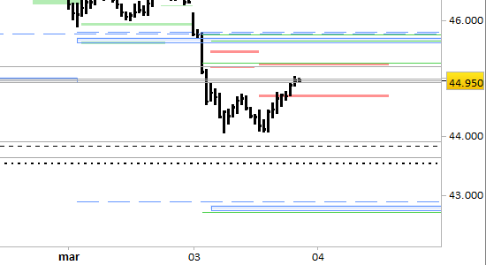 future FtseMib, grafico a barre da 30 minuti. Prezzi al 03/03/26, ore 20.08, last 44950