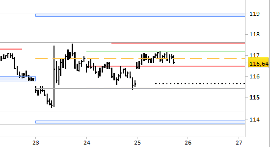I prezzi si trovano in stabilizzazione entro l’area delle resistenze valide ancora fino all’aggiornamento di domani, poste a 116.55 e 117.65. Il segnale short è ancora attivo fino all’aggiornamento di domani, ma il target è da avvicinare a 115.66/115.68; successivamente attenderemo indicazioni. Il segnale short resta attivo solo con rilevazioni stabilmente inferiori a 117.65.