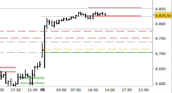 I prezzi hanno senato massimi a 6840.75 e si trovano attualmente in zona di probabile ripiegamento, fra le resistenze confermate ancora a 6824.00/27.00 e 6852.00/55.00.