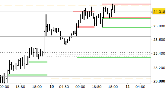 I prezzi sono stati finora respinti dalla resistenza principale di breve periodo con valenza 1-2 giornate, confermata ancora a 24115/24135. Le aspettative sono di cedimento dei supporti intermedi posti adesso a 23778/23783 e 23650/23680, con proiezioni a 23495 e 23366. Il segnale short di breve periodo verrebbe interrotto seccamente dal semplice superamento di 24135. A tale condizione sarebbe probabilmente necessario attendere la chiusura su grafico daily per ottenere nuove indicazioni di breve.