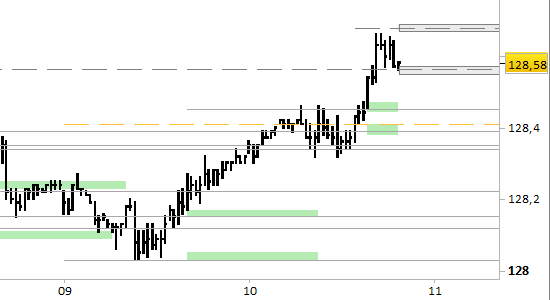 Future Bund, grafico a barre da 30 minuti. Prezzi al 10/02/26, ore 18.06, last 128.58