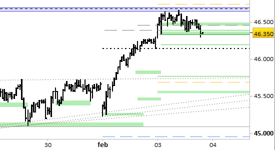 I prezzi hanno forato il supporto di brevissimo periodo (= fino a domattina) a 46330, segnando minimi a 46295 prima di tornare sopra al livello.