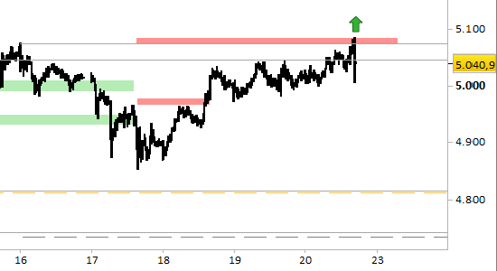 Future Gold, grafico a barre da 30 minuti. Prezzi al 20/02/26, ore 16.20, last 5040.9
