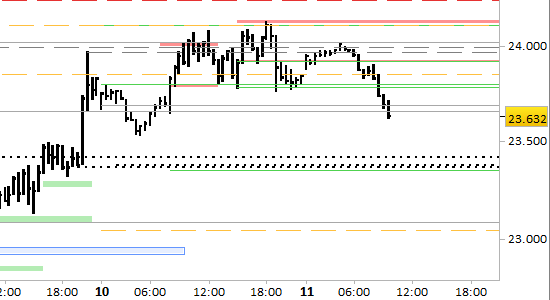 I prezzi sono stati finora respinti dalla fascia delle resistenze di breve periodo, poste a 23915/23930 e 24115/24135. Le aspettative a 1-2 sedute sono di cedimento anche del supporto intermedio posto a 23650/23680, con proiezioni ribassiste fino a 23495 e 23366. Il segnale short di breve periodo verrebbe interrotto seccamente dal semplice superamento di 24135. Per il momento non ci sono le condizioni per abbassare le resistenze e non sono visibili riferimenti di rilievo più vicini fra loro.