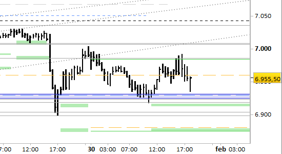 e.mini S&P future, grafico a barre da 30 minuti. Prezzi al 30/01/26, ore 18.29, last 6955.50