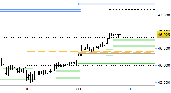 Tecnicamente ci sarebbero già adesso le condizioni per un allargamento del rialzo in accelerazione fino a 47670 fin dal breve periodo (= 1–2 giornate), in deciso avvicinamento alla resistenza di medio periodo posta a 47800. Fino a domattina i supporti sono confermati a 46750 e 46540. Il segnale long di breve è attivo solo con prezzi superiori a 46540.