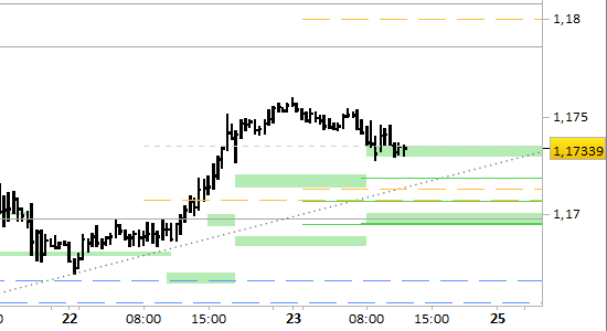 cross eur/usd, grafico a barre da 30 minuti. Prezzi al 23/01/26, ore 12.10, last 1.1733