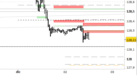 Conserviamo la posizione short aperta ieri a 128.31. Stop sopra 128.38 senza attendere alcuna conferma.